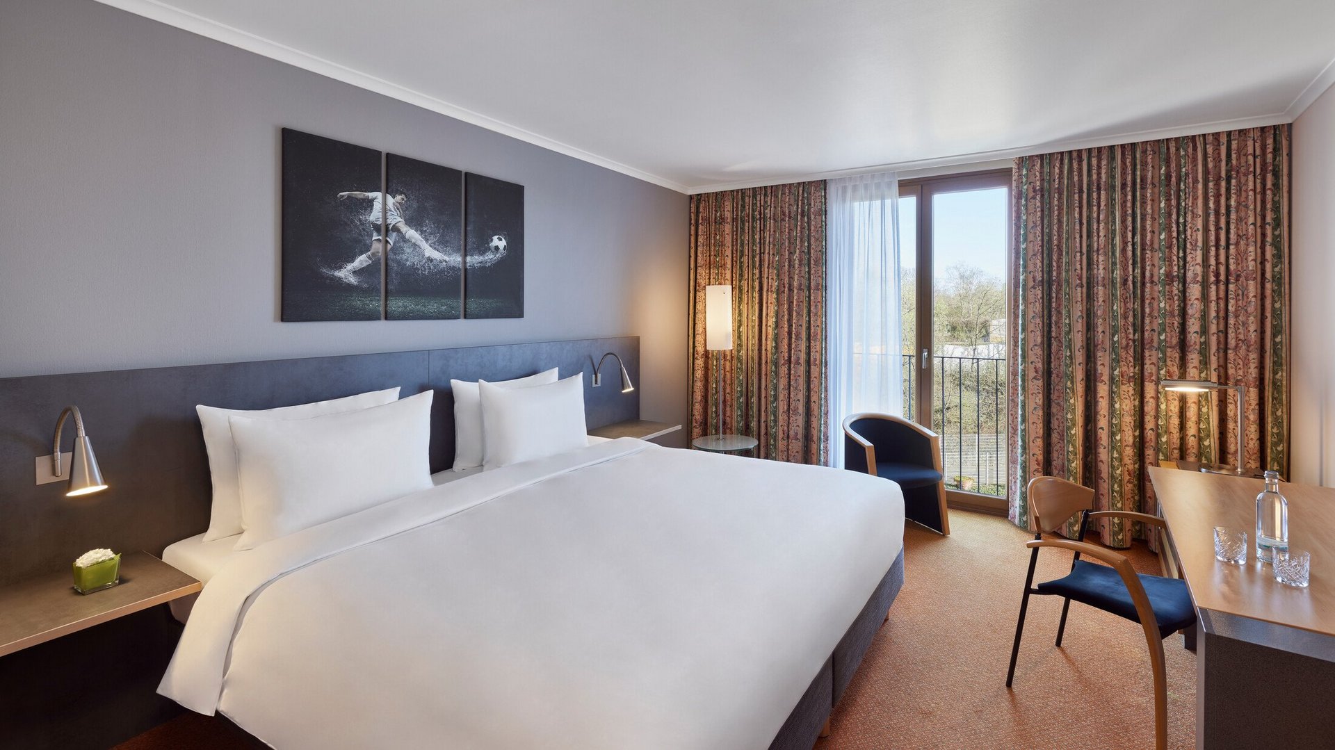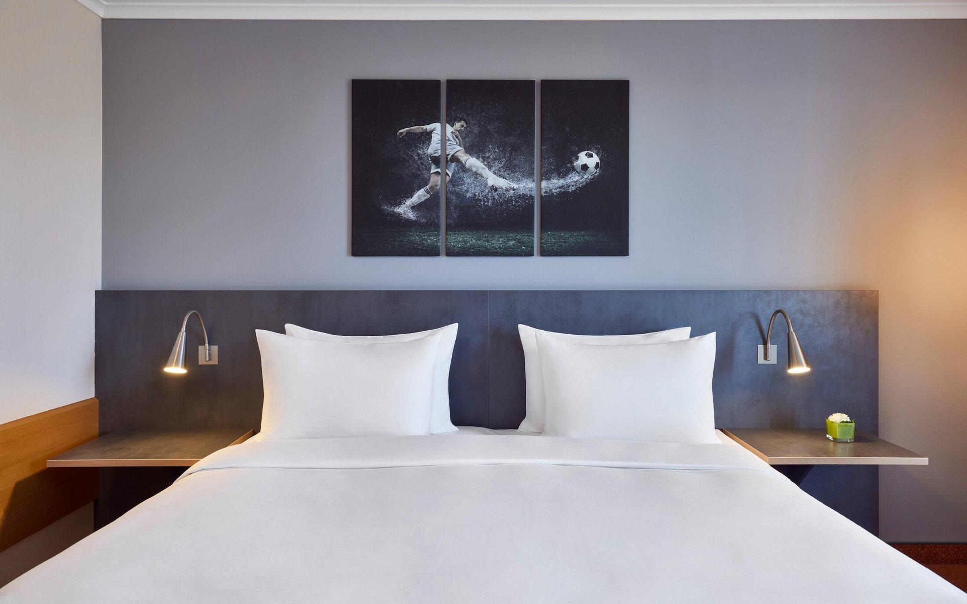 28 Quadratmeter Klarheit und Komfort – für alle, die nach einem langen Tag Ruhe brauchen. Unsere Deluxe-Zimmer sind modern gestaltet, in warmem Design und ruhiger Lage direkt in der Nordkurve. Hier trifft Stadioncharakter auf Freiheit zum Durchatmen – einfach ankommen, loslassen, abschalten.