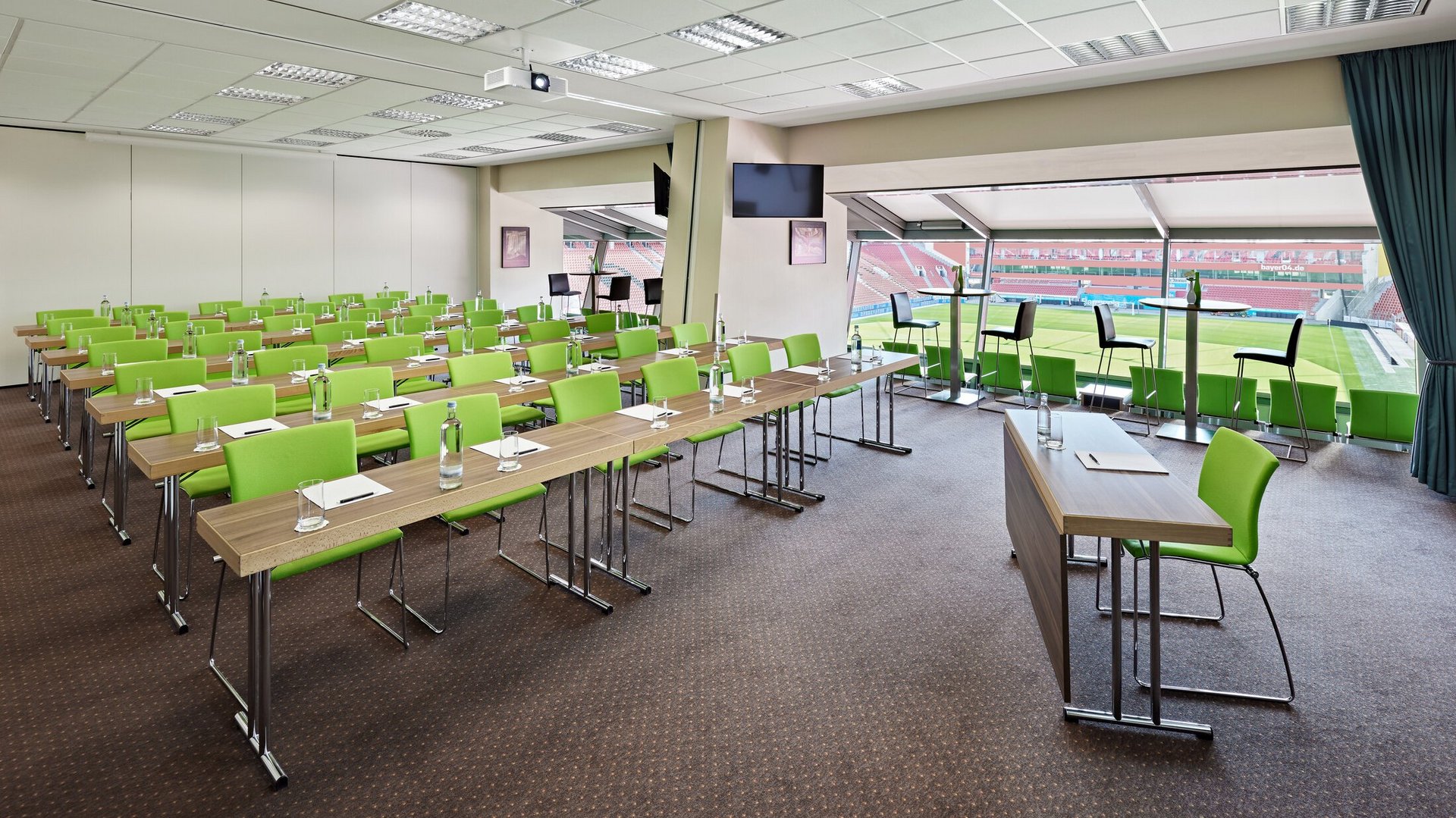 Moderner Tagungsraum mit Stadionblick: Der Raum Alibipass kombiniert Licht, Stil und Technik auf 55 m² – perfekt für produktive Meetings und Tagungen mit Atmosphäre.