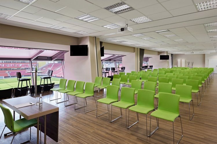 Workshop mit Weitblick: Der Raum Fliegenfänger bietet 55 m² Licht, Luft und Stadionenergie. Der perfekte Workshop-Raum in Leverkusen für kreative Sessions, Team-Meetings und Schulungen.